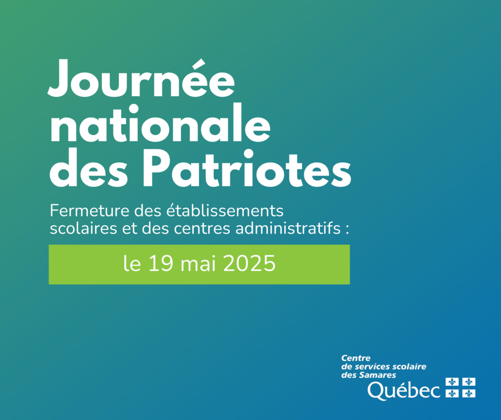 Veuillez noter que nos établissements scolaires ainsi que nos centres administratifs seront fermés le lundi 19 mai 2025, à l’occasion de la Journée nationale des Patriotes.